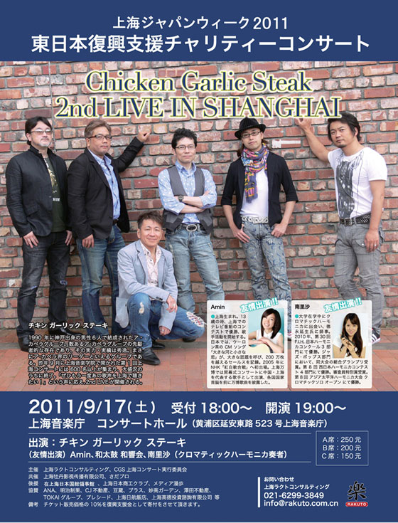 2011年9月17日(土)に、上海ジャパンウィーク2011年の一環として、東日本復興支援チャリティコンサート チキンガーリックステーキ2ndLIVEin上海 を開催をしました。 日本から、アカペラグループ「チキンガーリックステーキ」、 サントリーのCMの曲で有名な「Amin」、日本ハーモニカコンクール3部門優勝の 「南里沙」さんが登場し、約1000名に御参加頂いた会場は大いに盛り上がりました。
