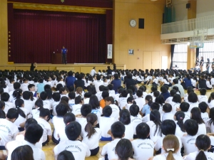 2014年9月4日、上海日本人学校浦東校にオリンピックメダリストの池谷幸雄さんをお招きし、小学部では体操教室、中学部では講演会を開催しました。合計1400名の児童・生徒さんたちは、目をキラキラさせながら本物のオリンピックメダルに触れたり、池谷さんが見せてくれたバック転に驚いたりしていました。